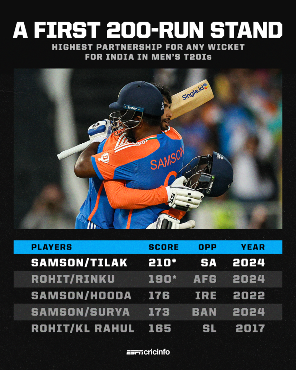 Samson and Tilak put on a staggering 210-run stand for the second wicket, rewriting several records along the way. This was the first time a Full Member side achieved two individual centuries in the same T20I innings, and it brought India’s tally to four centuries in the series, a feat no other team has matched. Samson’s 109* featured nine sixes, with a balanced distribution of runs on both sides of the wicket. Meanwhile, Tilak’s 120* included 10 sixes, most of which came on the leg side.